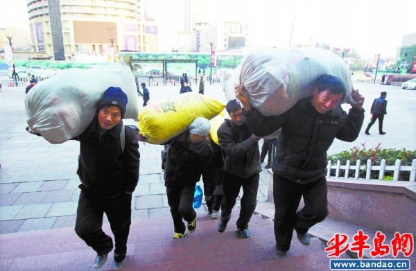 12月9日下午3点左右,在青岛火车站广场上,菏泽老家的小李和工人们带着行李回家过年。据了解,小李和工人都是木匠。因为还有一个多月过年,装修进入淡季,留在青岛要交房租水电费,干脆提前回家。