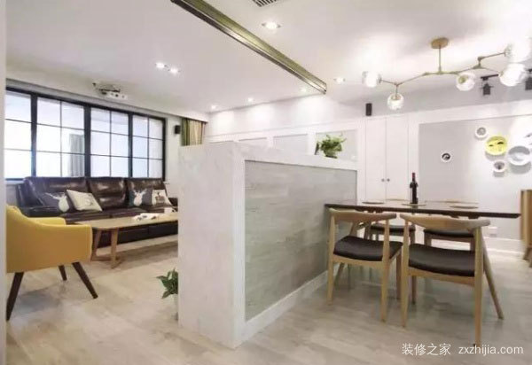 客厅和餐厅的空间可以用矮墙、酒柜或装饰柜作为隔断,使两个空间的功能更加明显,两个空间间隔不断,视觉上看起来更大。