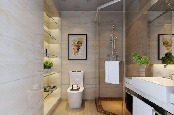 对于小浴室来说,卫生洁具非常实用,如双杆毛巾架,看起来不错,但实际使用不大。此外,放置化妆品的玻璃隔板应具有良好的质量,以避免玻璃隔板因物品过重而脱落,造成不必要的损失。